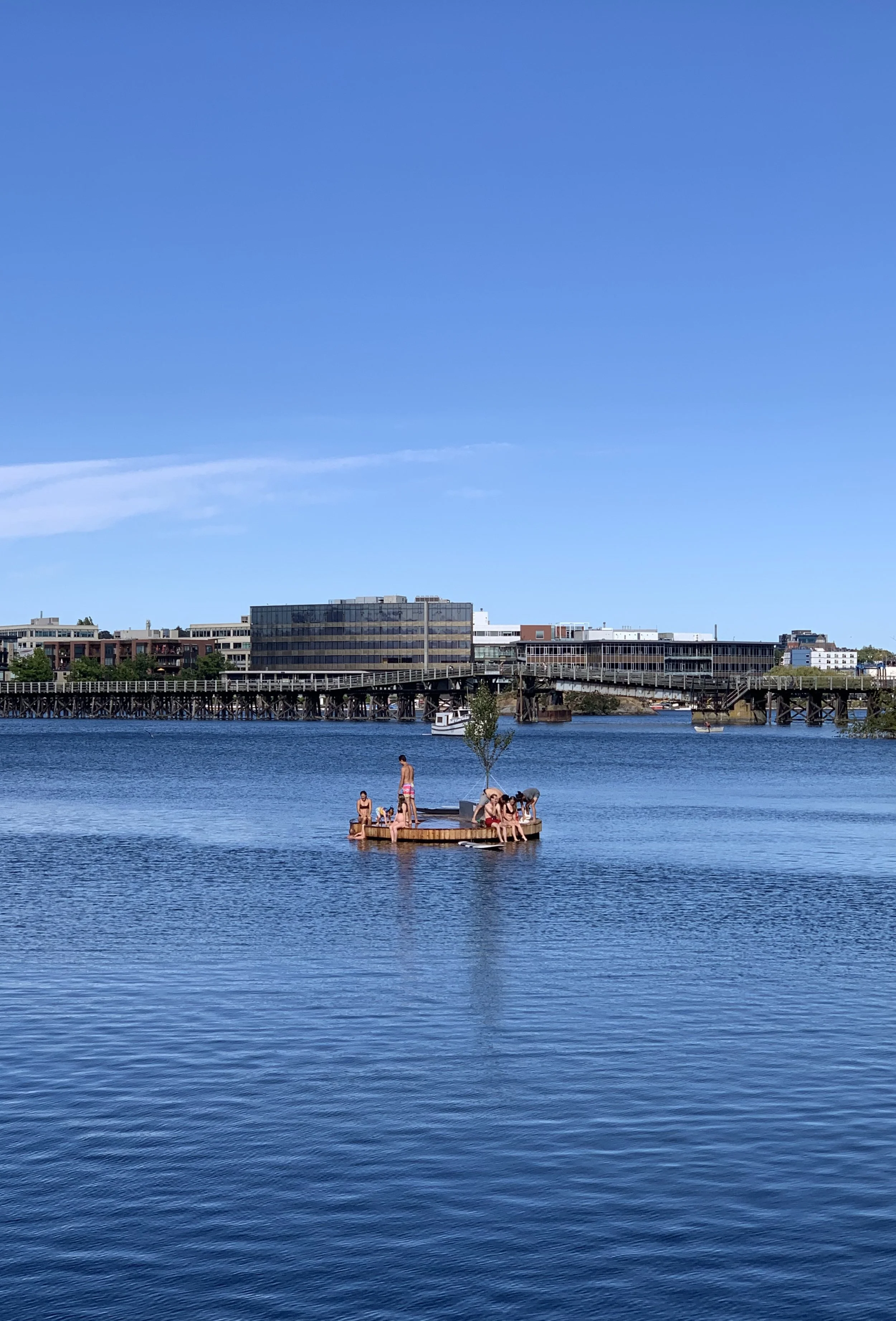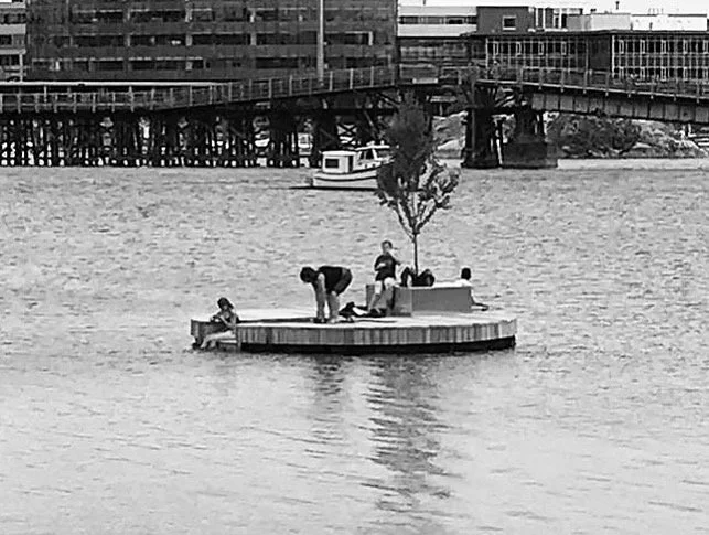 Instigated by Aryze Projects and inspired by Scandinavian urban harbour swimming facilities, this pro-bono project was designed to promote and be a catalyst for the rediscovery and reclaiming of urban harbour waters for swimming and recreation. The floating platform with its whimsical tree, was secretly towed into place under cover of night, to the beachfront of a little-used city park. It was quickly discovered by children and adults and has become a destination for swimmers, kayakers and community groups. The platform was donated to the City which allowed it to remain despite not having granted permits initially.