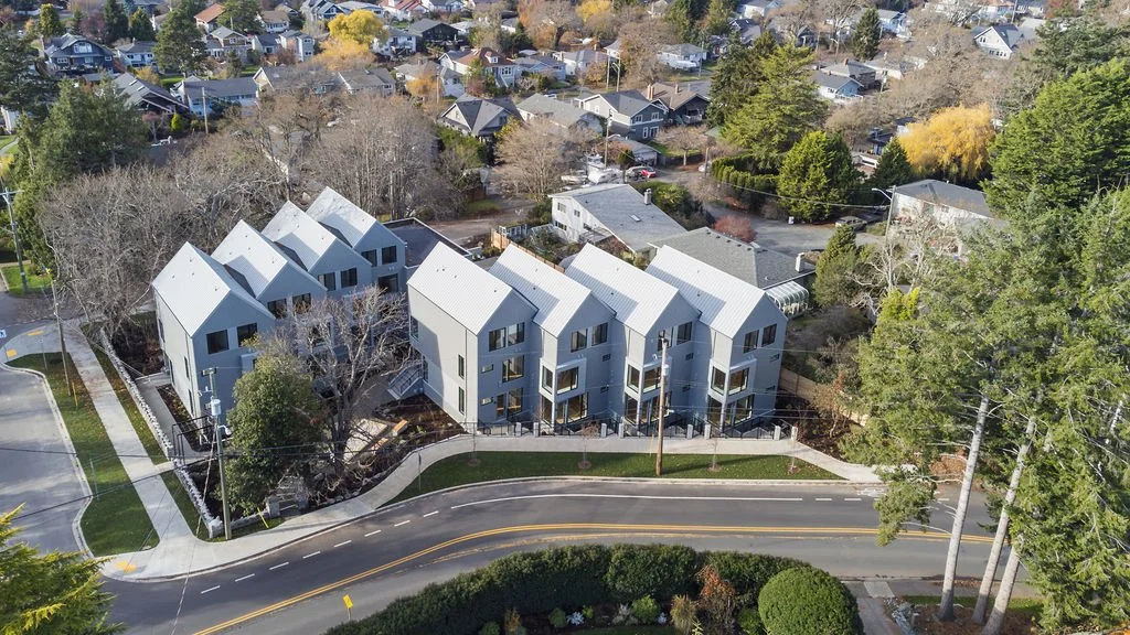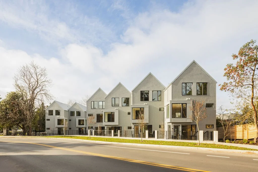 Composed of 18 suburban townhouses the project infills a half-acre corner lot formerly occupied by a large early 20th century mansion. Two rows of stacked townhouses are sited to preserve mature trees and allow for generous new landscaping. The two and three-bedroom units each have a front porch entry to foster community connection via the street and to the surrounding landscape. The building are contemporary while incorporating elements inspired by the history of this early suburban neighbourhood. Deeply set windows, shingle cladding, gabled roof form, and porches are adopted from the area’s Craftsman-era character. A restored, gated mortared stone wall is preserved along the southeast perimeter and a footpath connects each house to a landscaped commons and children’s play space.