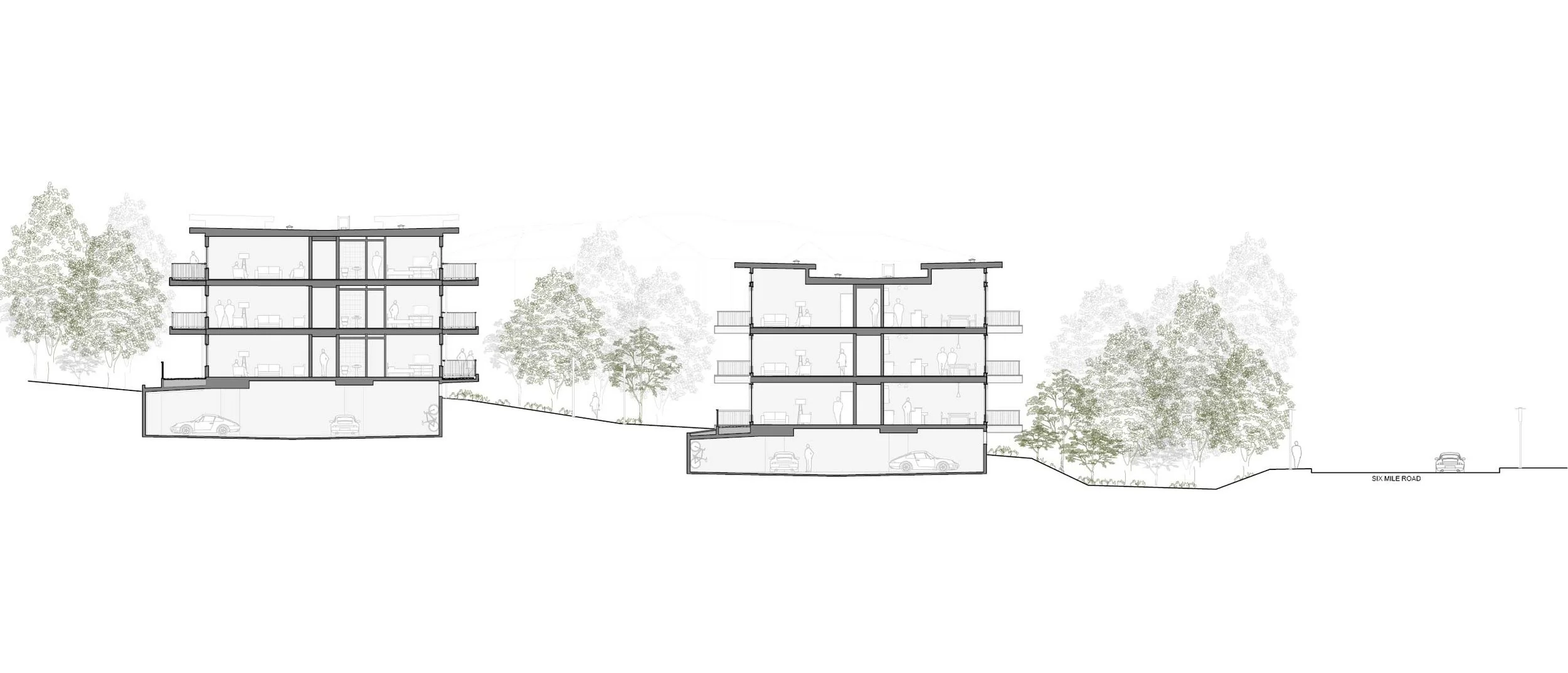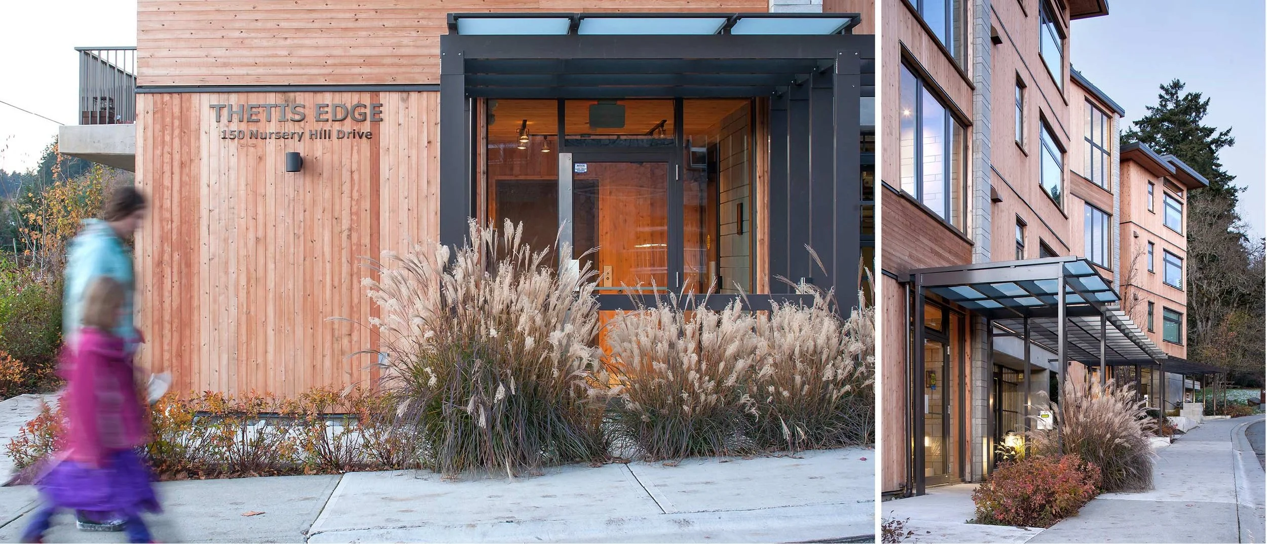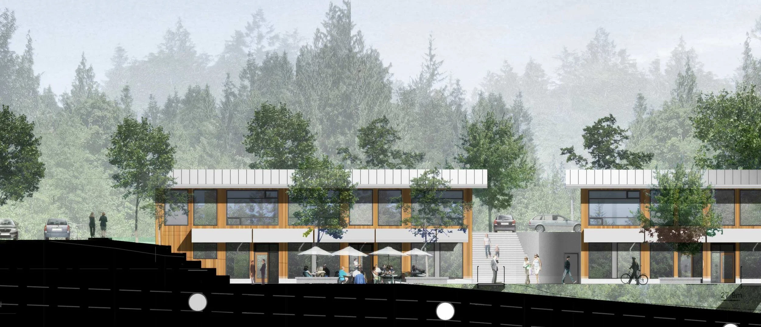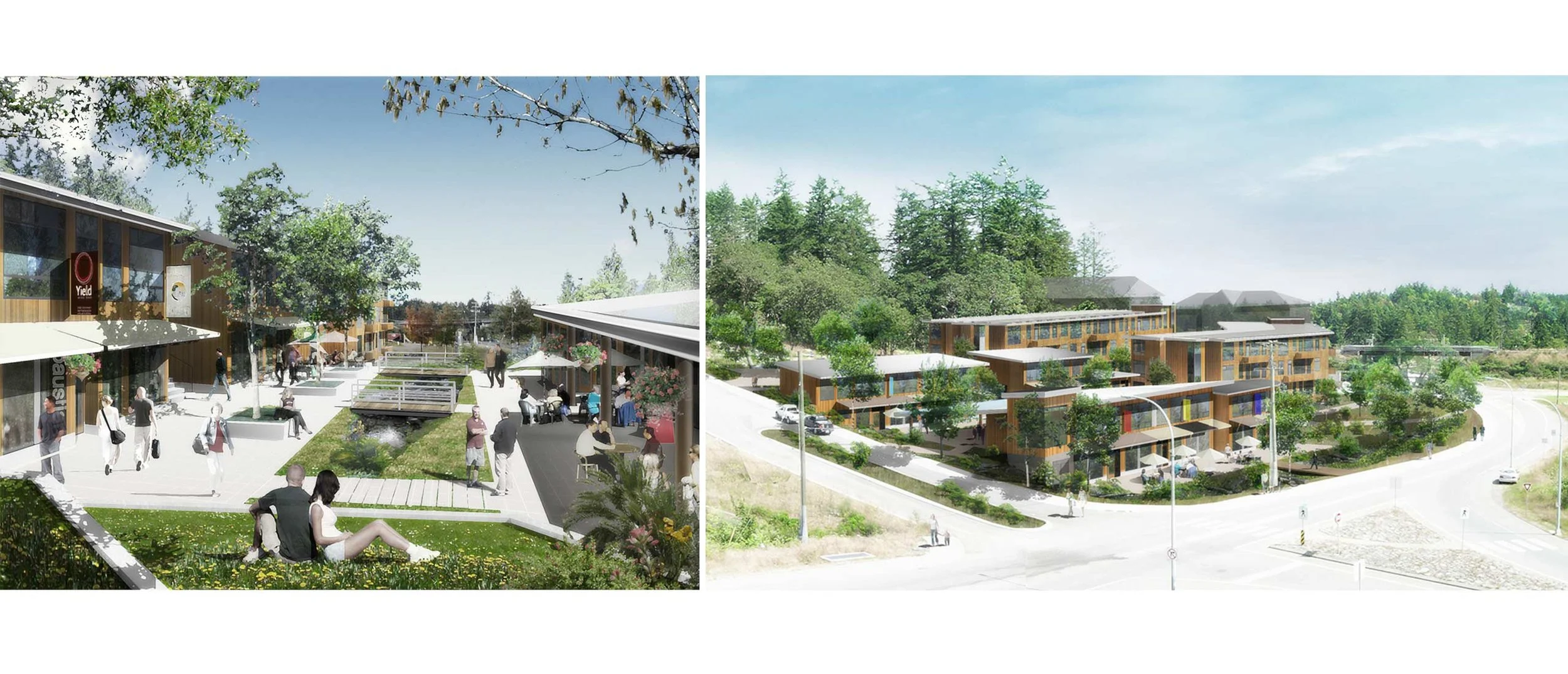 This project includes both multi-residential buildings and commercial space, arranged on either side of a terraced and richly landscaped courtyard. The courtyard serves to join the surrounding streets and sidewalks with the pedestrian network of the adjacent park and the Galloping Goose regional trail. Paths and small bridges over a bioswale connect the courtyard and shops to Six Mile Road. This functional storm-water management landscape feature forms the edge of the project along the length of the Six Mile Road frontage.