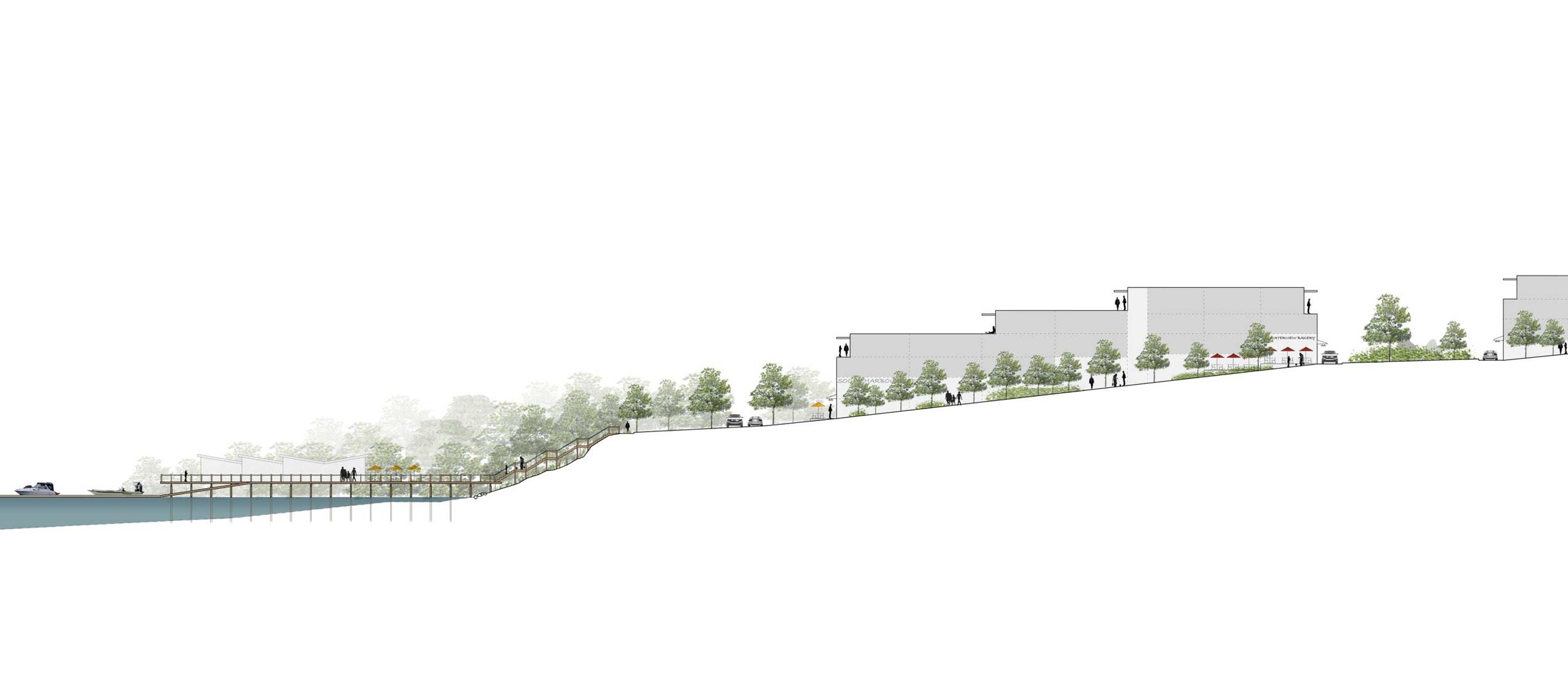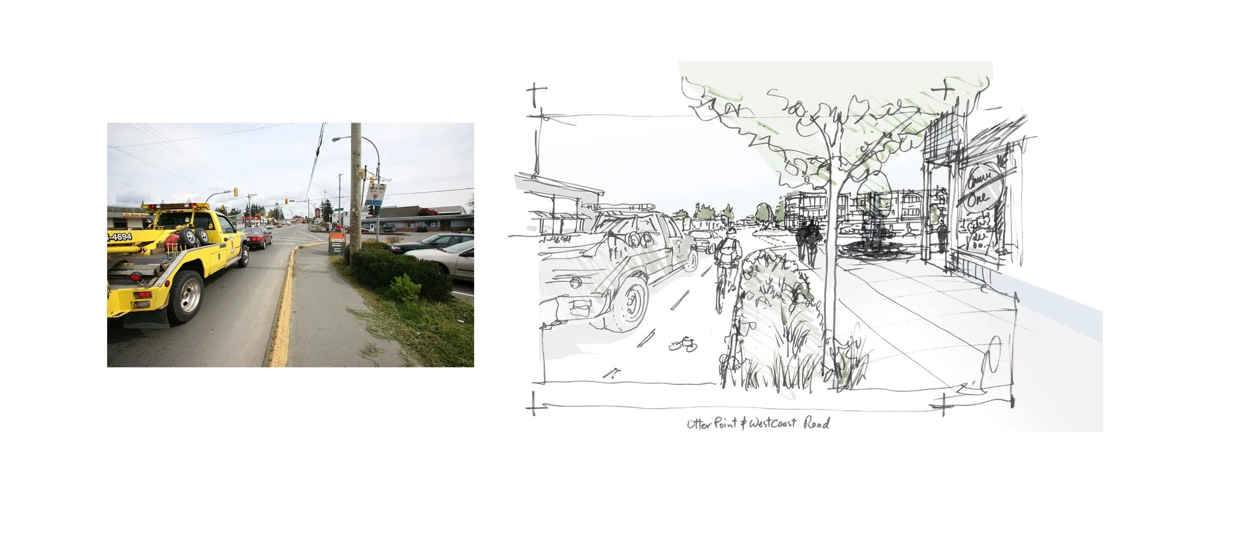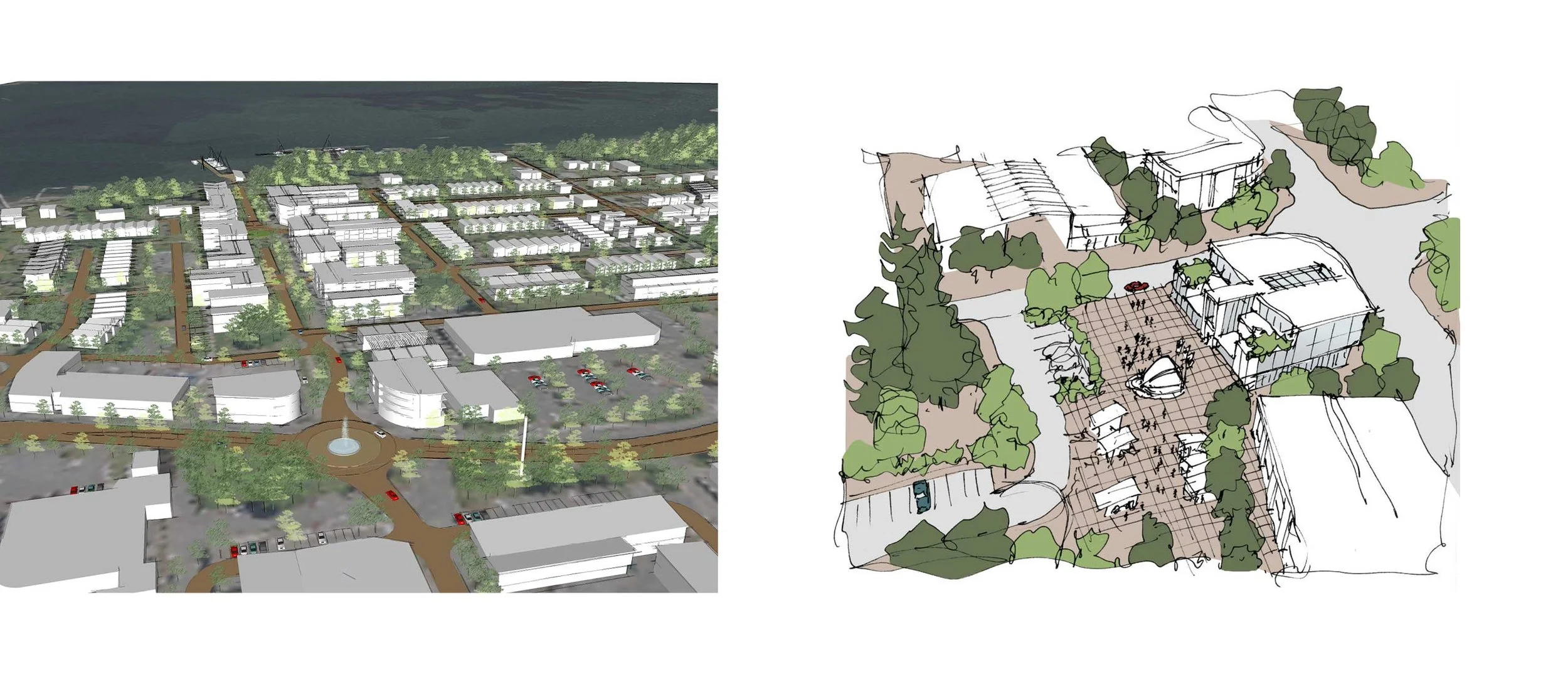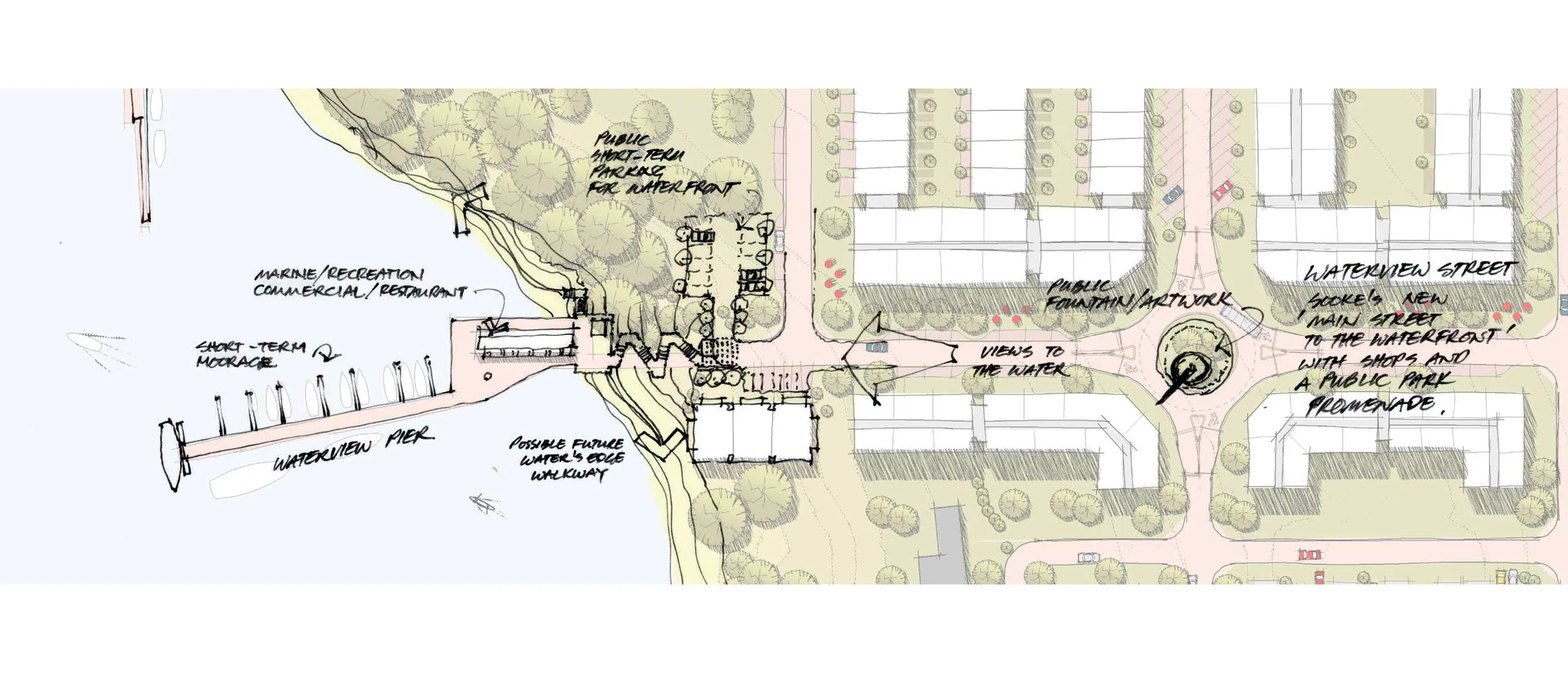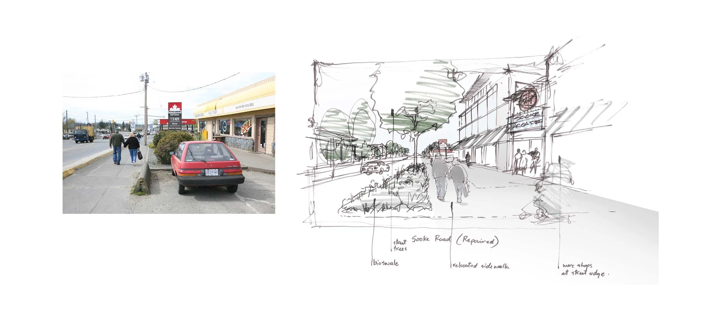 Beginning with an existing street layout and property boundaries, a plan was prepared to expand them into a complete network of streets and open spaces. The goal is to foster a fully functioning town centre in a new location, removed from the highway. A new shop-lined “high street” will visually and physically link Sooke to the waterfront, acting as a backbone for the town centre. In the surrounding area, locations have been picked out for commercial and residential development, arts and cultural facilities, a public plaza, a library, and a farmer’s market.